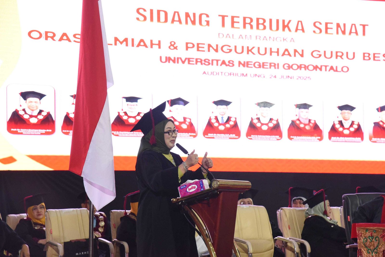 UNG –(Go-Pena.id) - Universitas Negeri Gorontalo (UNG) kembali mencatat sejarah akademiknya dengan mengukuhkan Prof. Dr. Fitryane Lihawa, M.Si., sebagai Guru Besar dalam bidang Pengelolaan Daerah Aliran Sungai (DAS) dan Lahan, Selasa (25/6/2025), melalui Sidang Senat Terbuka yang digelar di Auditorium UNG.