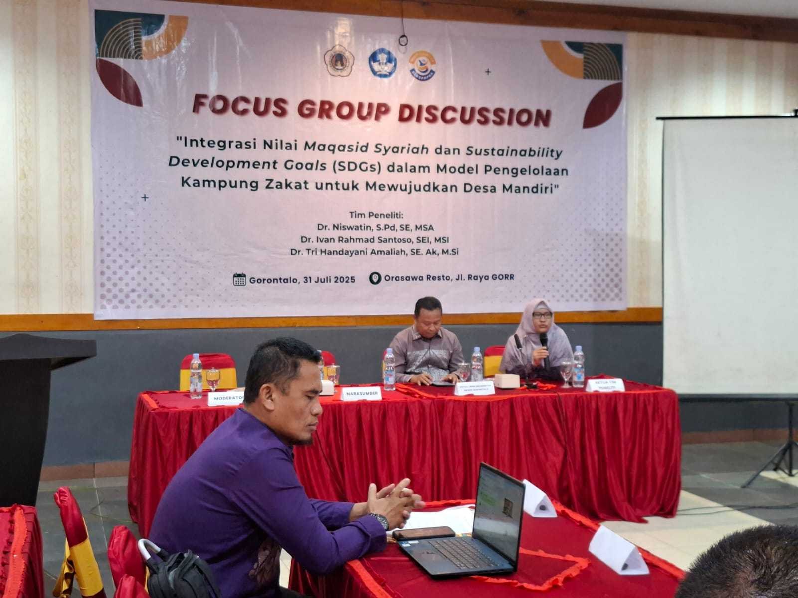 Dr. Niswatin, S.Pd., SE., MSA selaku Ketua Tim Peneliti menjelaskan bahwa kegiatan ini bertujuan untuk merumuskan model integratif antara prinsip-prinsip Maqasid Syariah dan tujuan pembangunan berkelanjutan (SDGs), khususnya dalam pengelolaan kampung zakat di Provinsi Gorontalo.