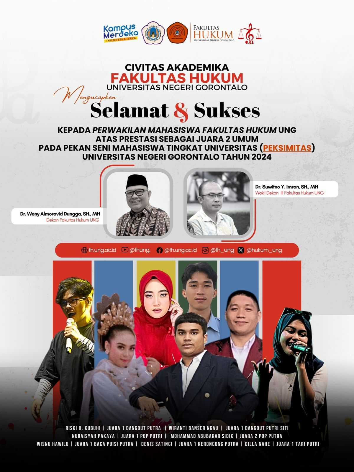 Wakil Dekan III Fakultas Hukum UNG, Dr. Suwitno Y. Imran menyampaikan bahwa prestasi yang diraih oleh mahasiswa Fakultas Hukum dalam Peksimitas ini merupakan hasil kerja keras dan juga pengembangan bakat yang dimiliki oleh para mahasiswa Fakultas Hukum UNG.