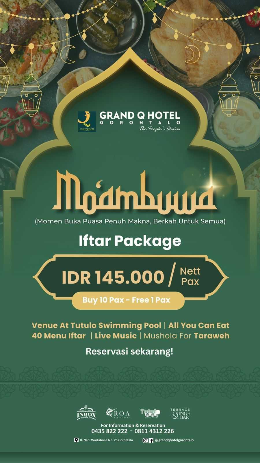 Dengan harga terjangkau dan konsep eksklusif, Mo’ambuwa di Grand Q Hotel Gorontalo menjadi alternatif berbuka puasa yang tak hanya lezat, tetapi juga penuh makna dan kebersamaan.